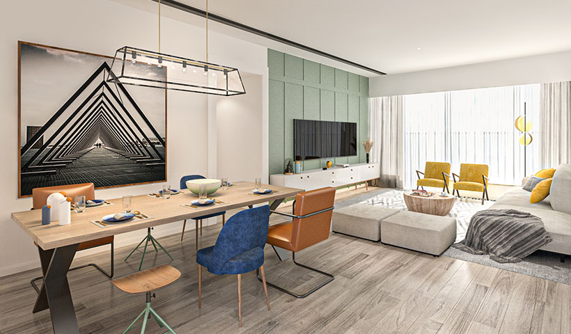 The above rendering represents an artist’s impression of the relevant parts of Unit A on 18/F of Tower 1 (1A) of the Phase only. It does not represent the actual view from or actual condition of the residential property upon handover and is for reference only. The design, colour, layout, materials, fittings, finishes, appliances, plants, landscape, facilities, furniture, decorative items, lighting features and objects etc. (if any) are not standard provisions upon handover, and may not be provided in the residential property upon completion of the Phase. The provision of fittings, finishes, appliances and furniture (if any) is subject to the terms and conditions of the agreement for sale and purchase. The Vendor reserves the right to amend the building plans and other plans of the Phase from time to time. The design of the Phase is subject to the final plans approved by the relevant Government authorities. The above rendering does not constitute and shall not be construed as the Vendor making any express or implied offer, representation, undertaking or warranty (whether related to view or not). Prospective purchasers should not rely on the rendering for any purpose whatsoever. Please refer to the sales brochure for details and standard provisions upon handover of the residential property. Please refer to the sales brochure for details of the noise mitigation measures in relation to the residential properties in the Phase.